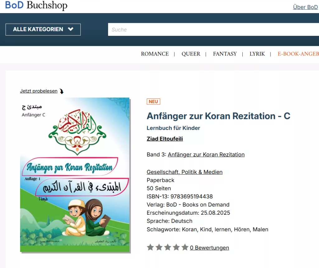 Dieses Buch präsentiert das 3.te Buch aus der Reihe „Anfänger zur Koran Rezitation“. Es bedient Kinder, die die Koran Suren mit kreativen Arbeiten lernen möchten. Es ist zweisprachig (Deutsch und Arabisch) ausgeprägt. Zum Beginnen mit dem Lernen des Heiligen Korans empfehlt es sich mit dem 1.ten Buch „Anfänger zur Koran Rezitation – A“ anzufangen.